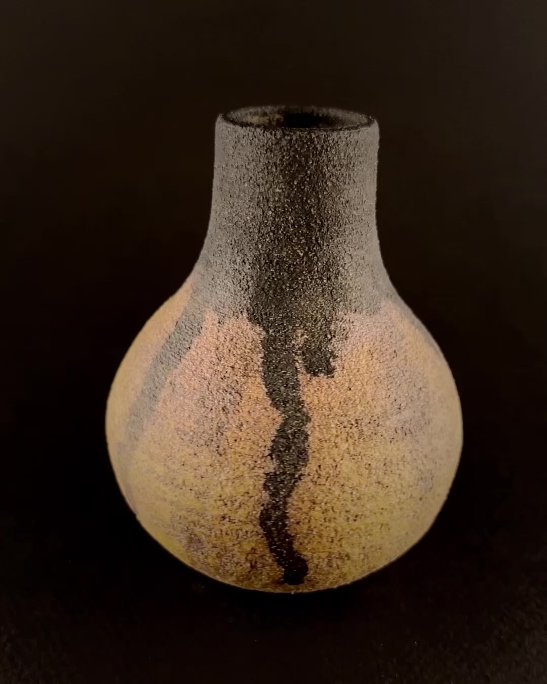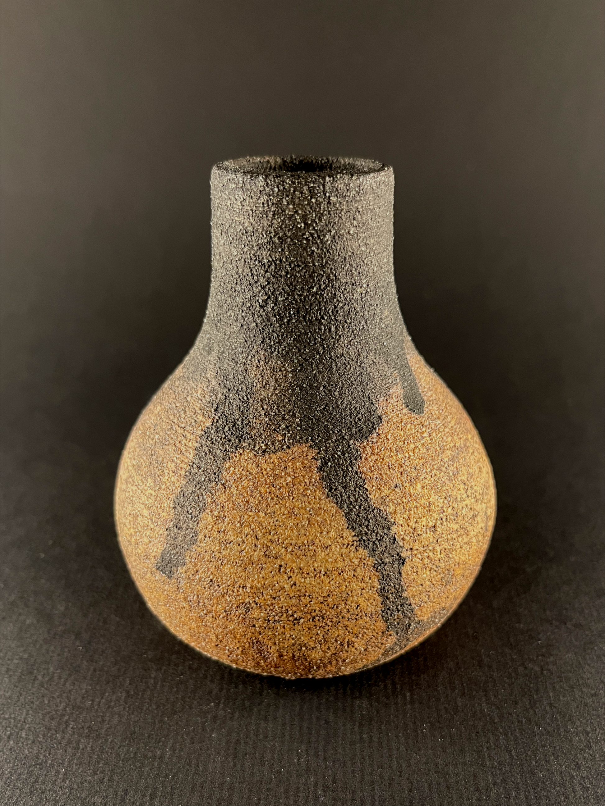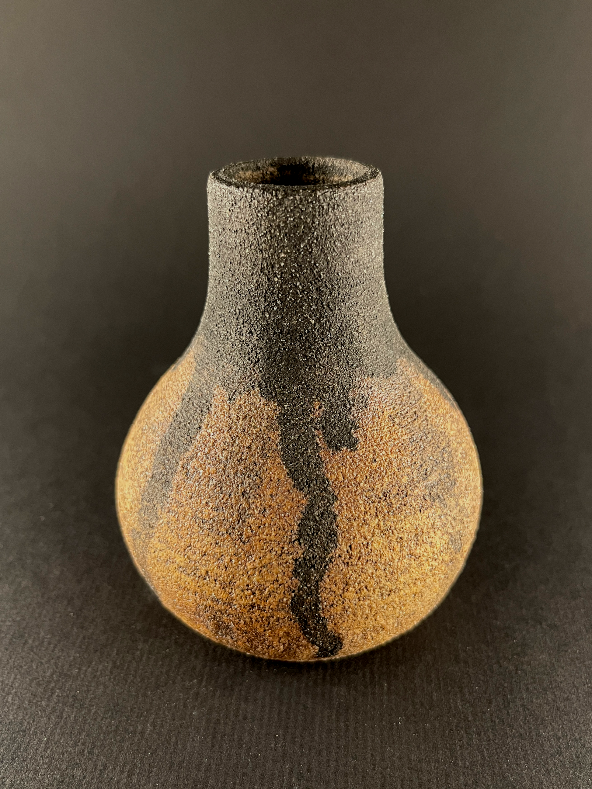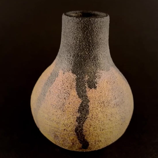 Small hand thrown bottle stained with red iron oxide and heavy black underglaze dripped from the neck.