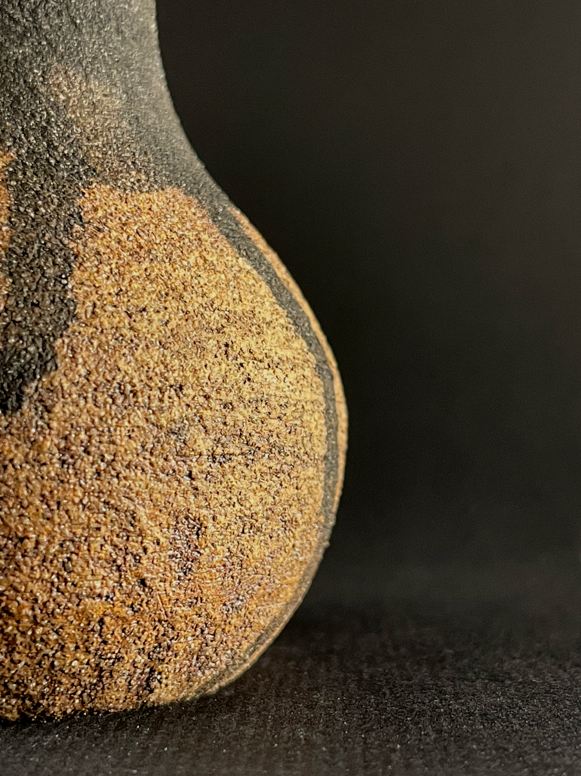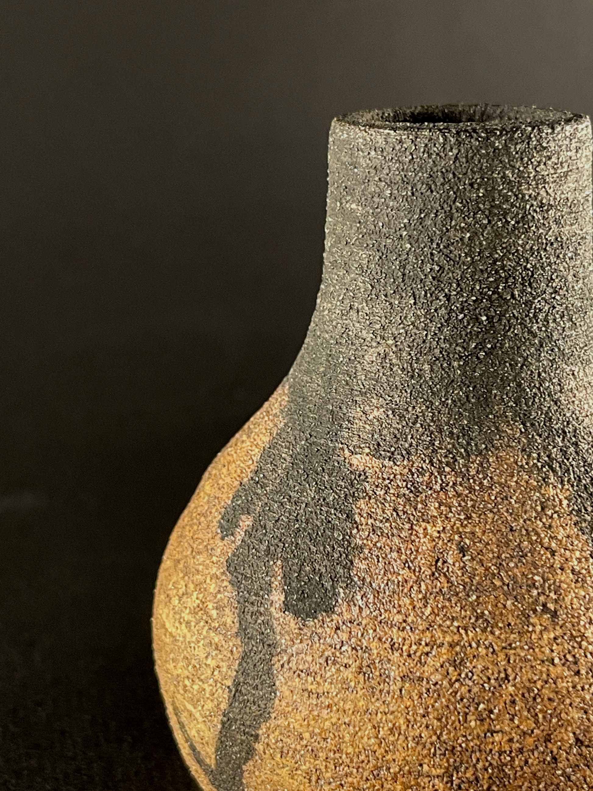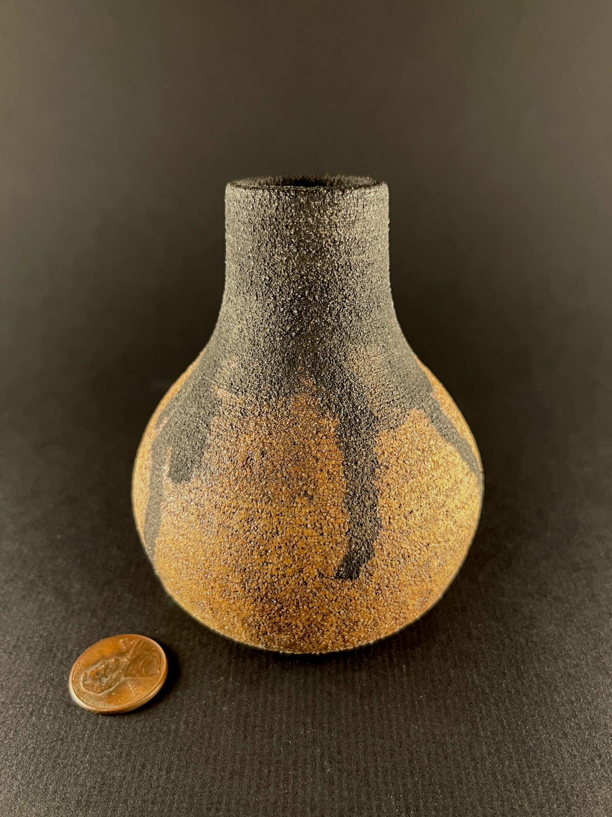 Small hand thrown bottle stained with red iron oxide and heavy black underglaze dripped from the neck.