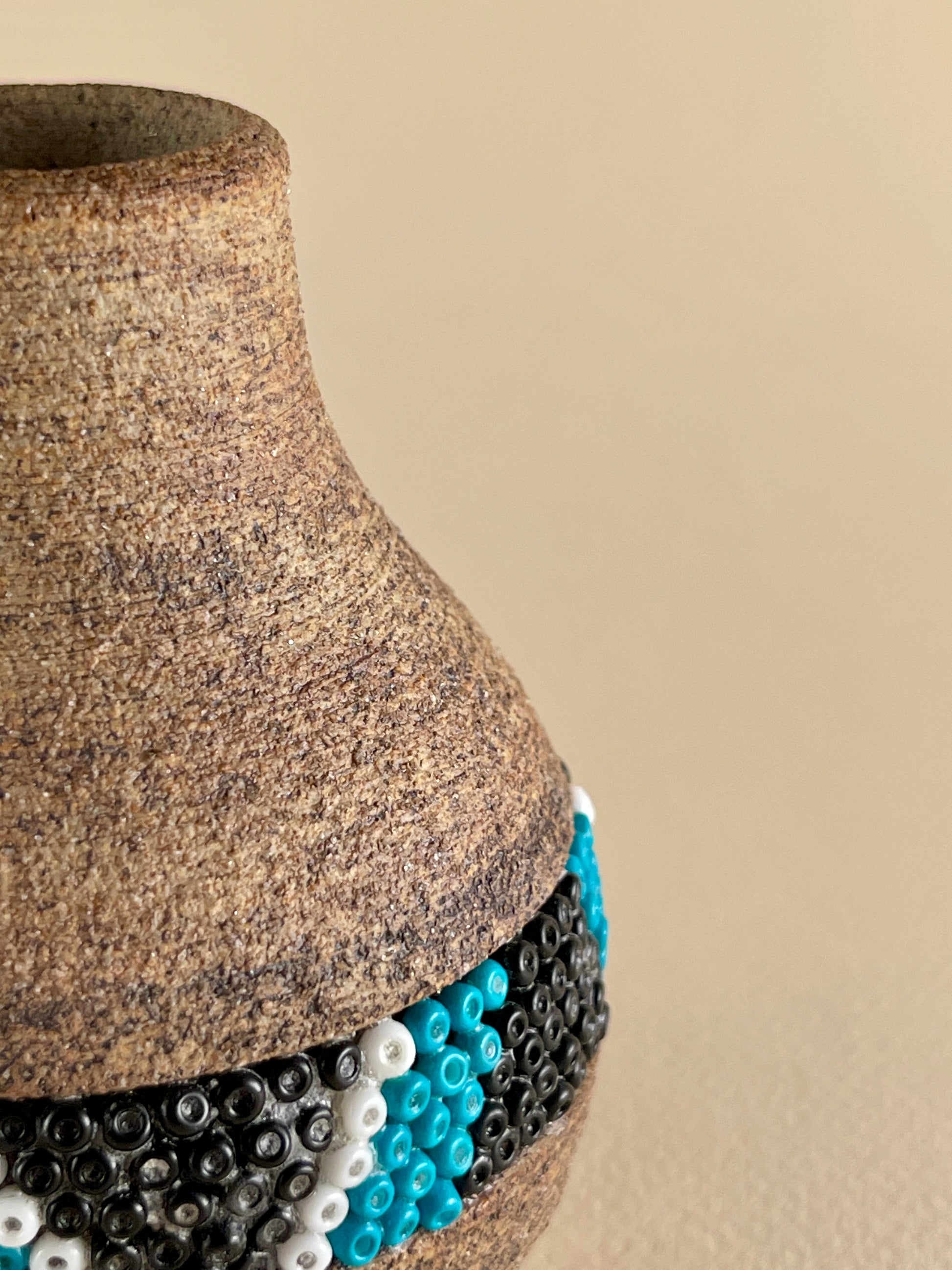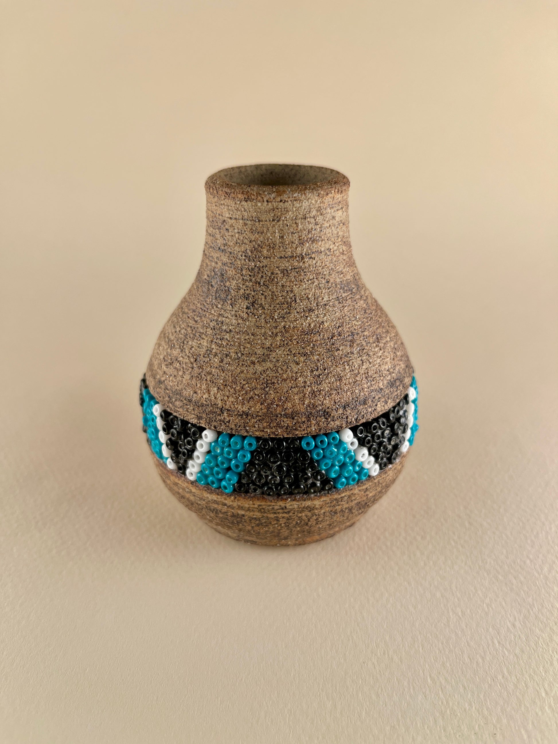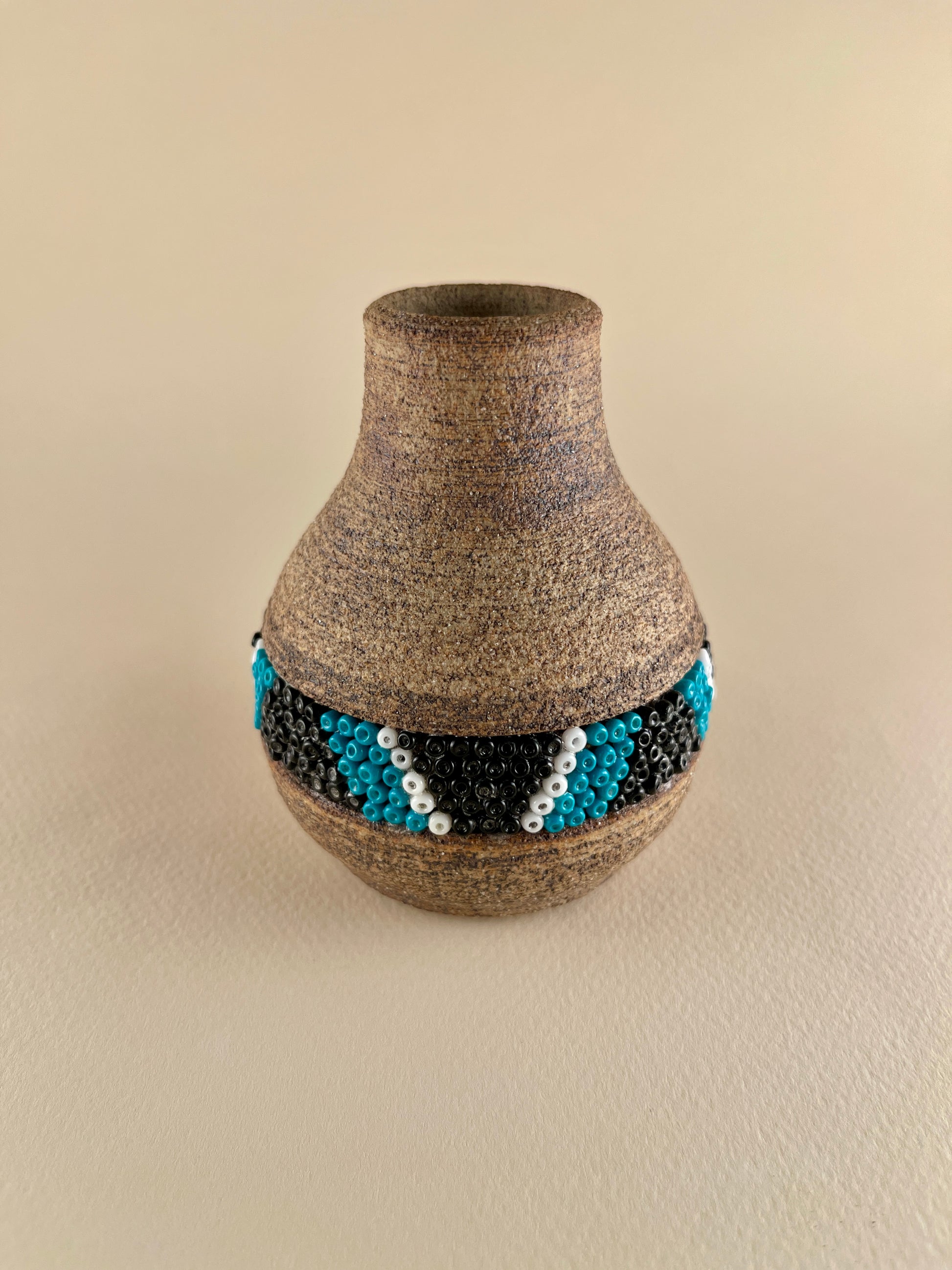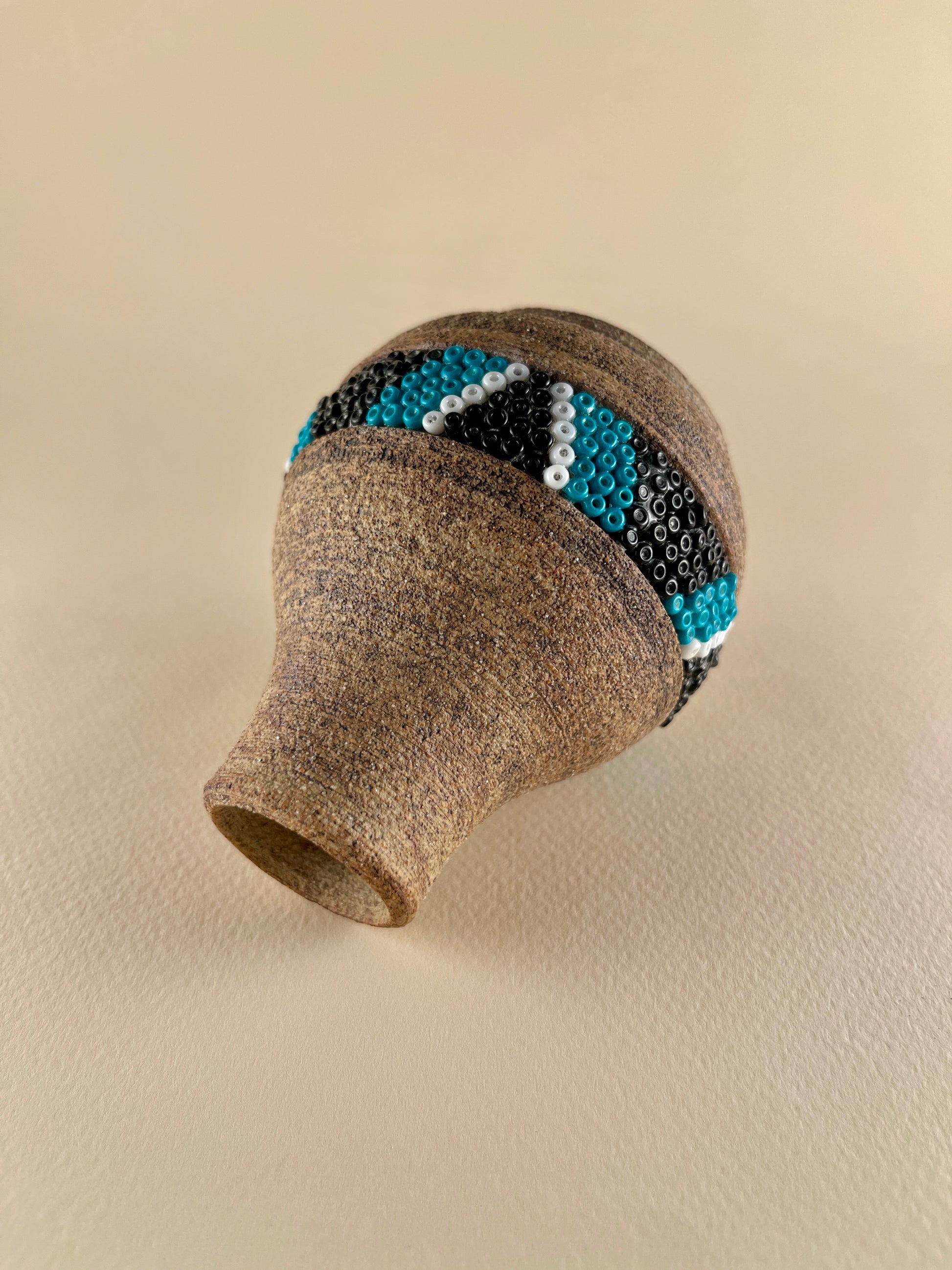 Small hand thrown bottle lightly stained with red iron oxide. Decorated with glass beads