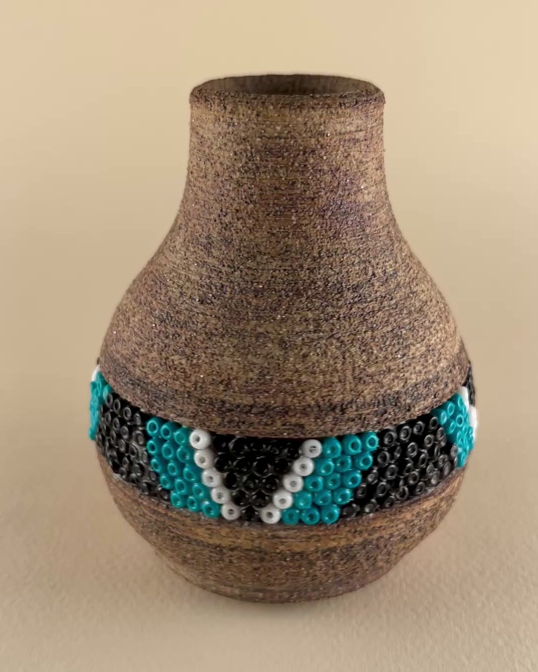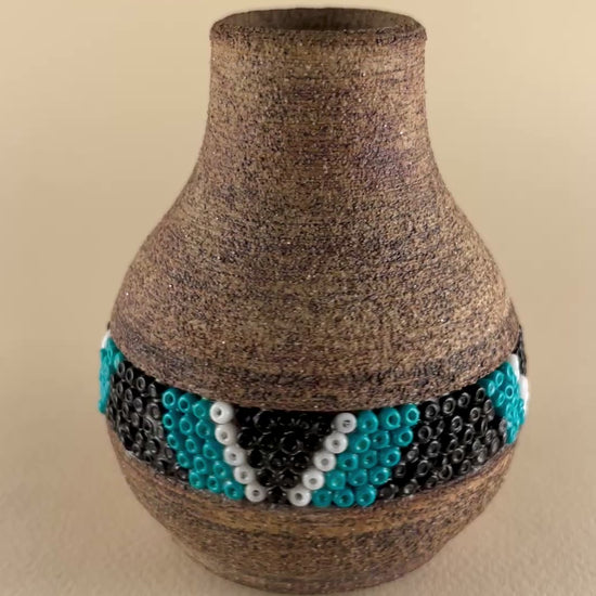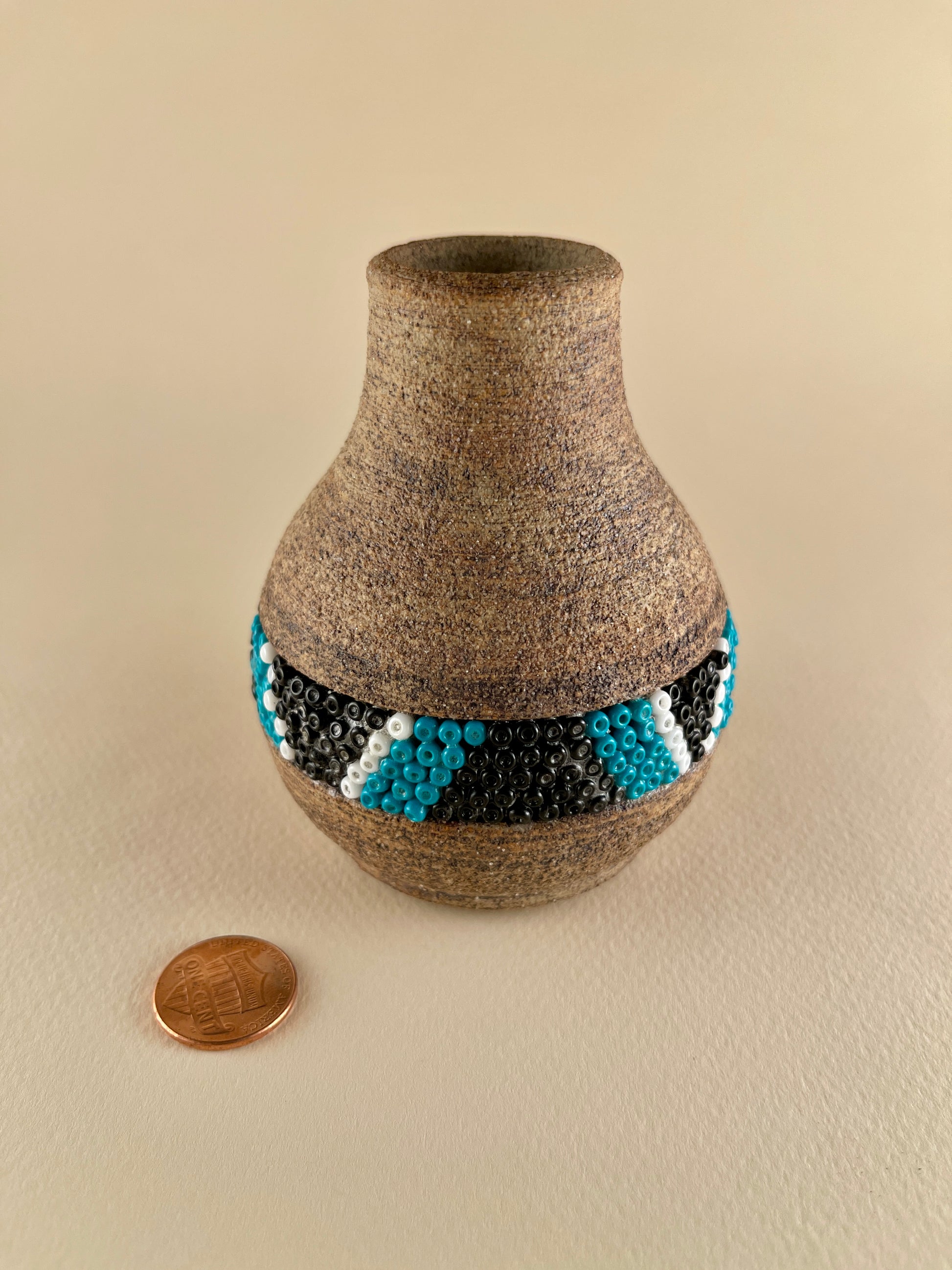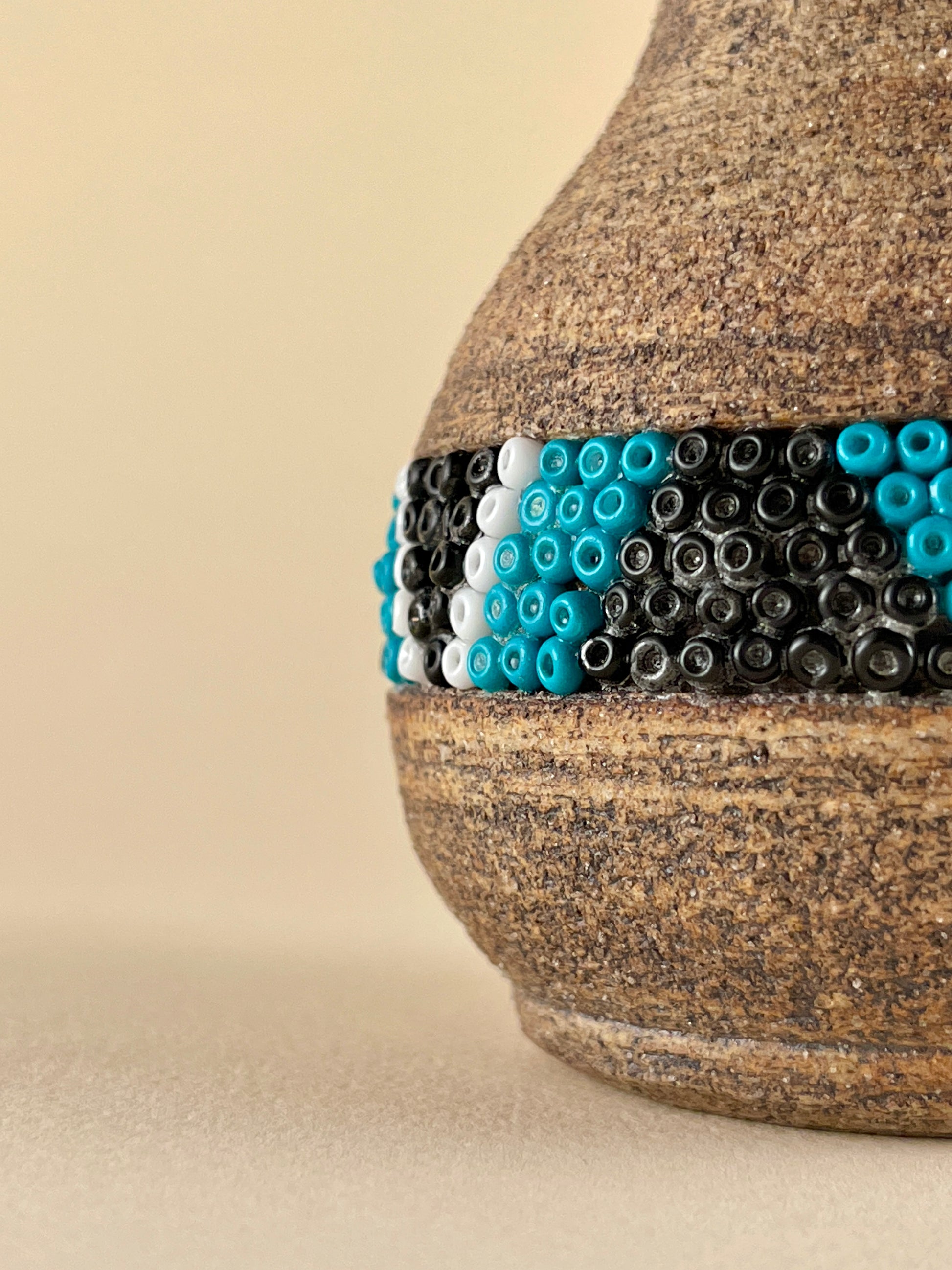 Small hand thrown bottle lightly stained with red iron oxide. Decorated with glass beads