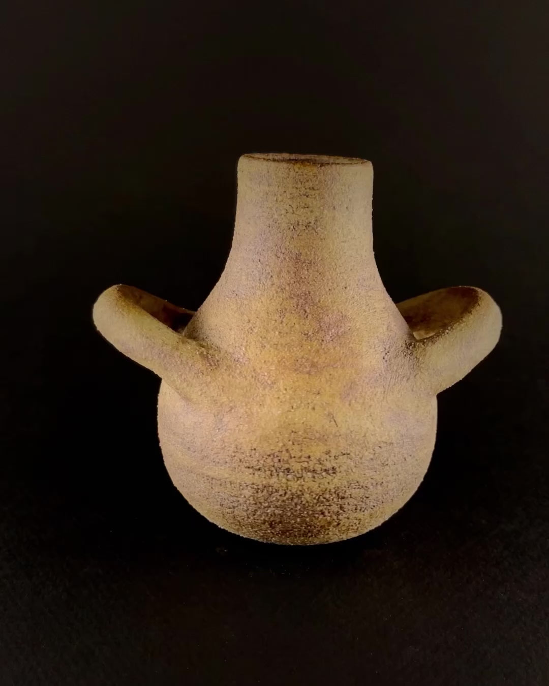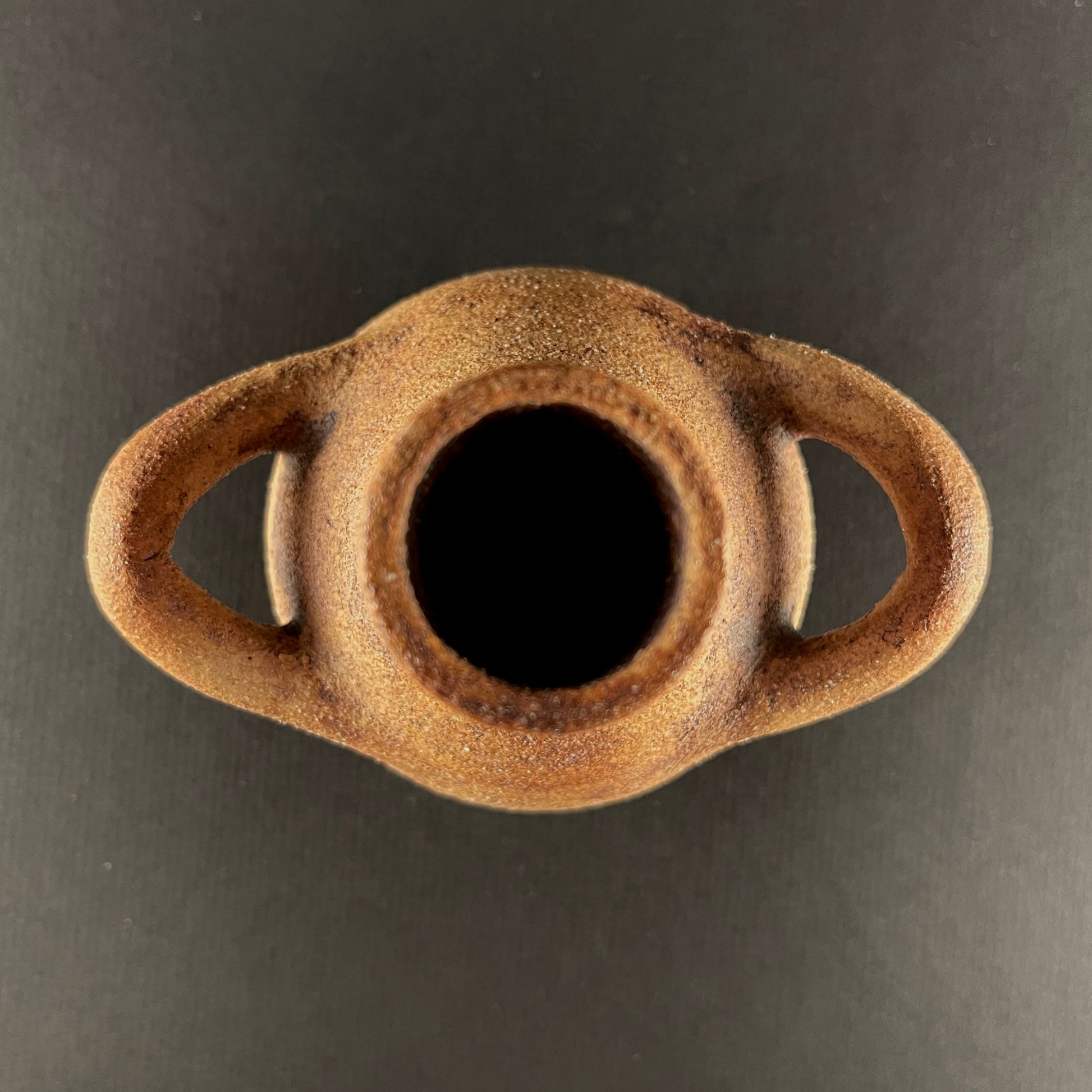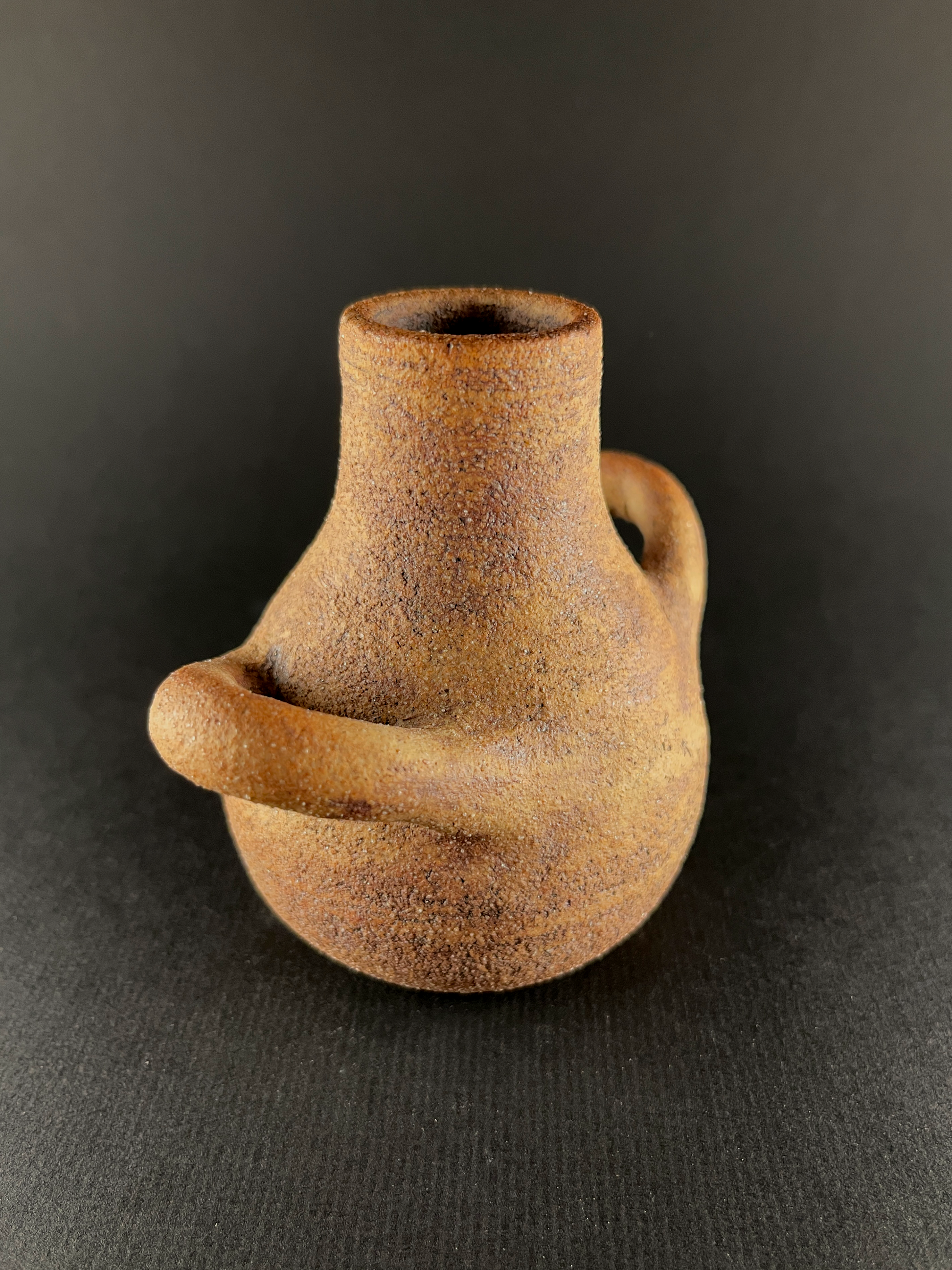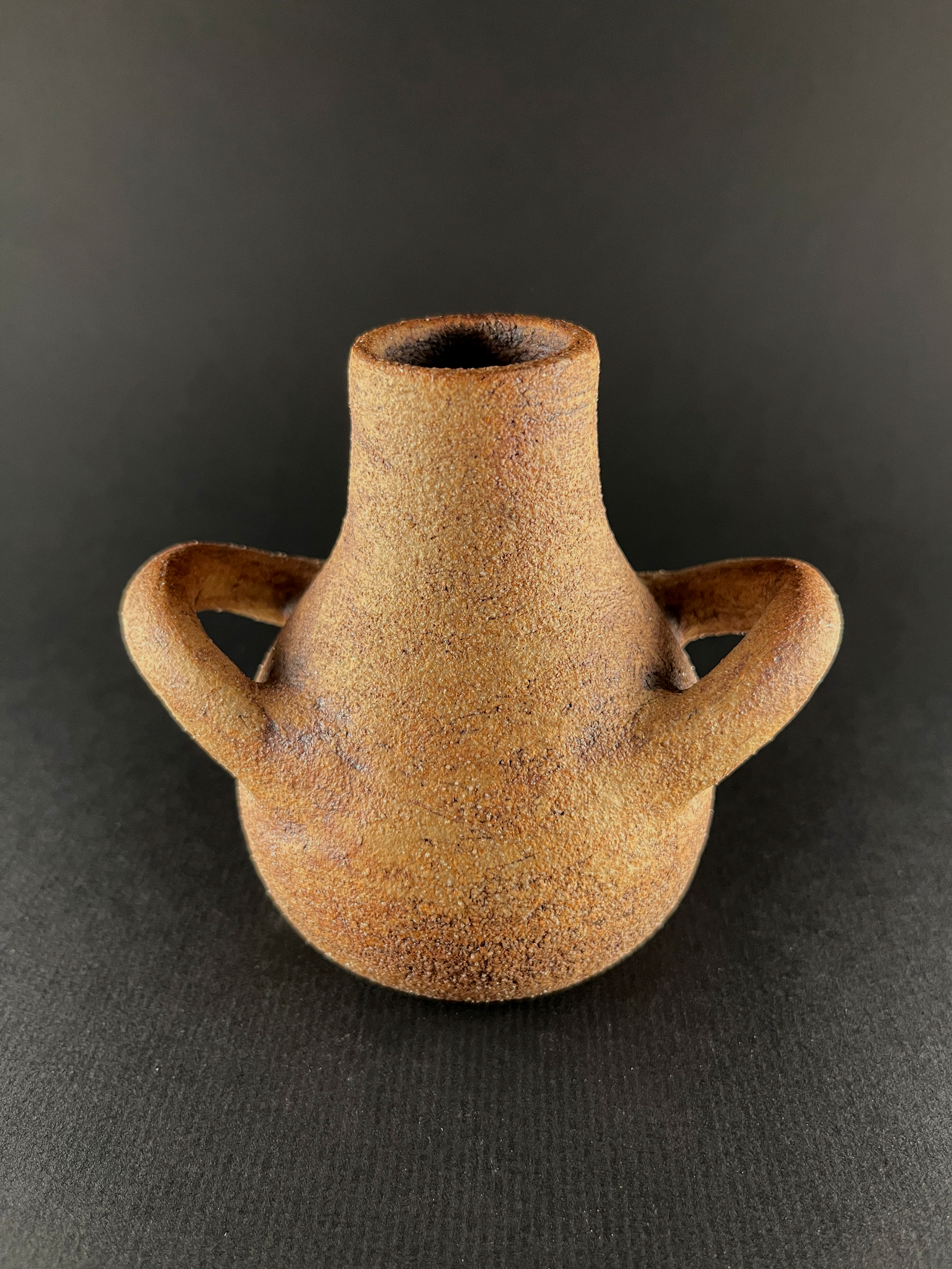 Small hand thrown bottle stained with red iron oxide. Handles added on opposite sides.