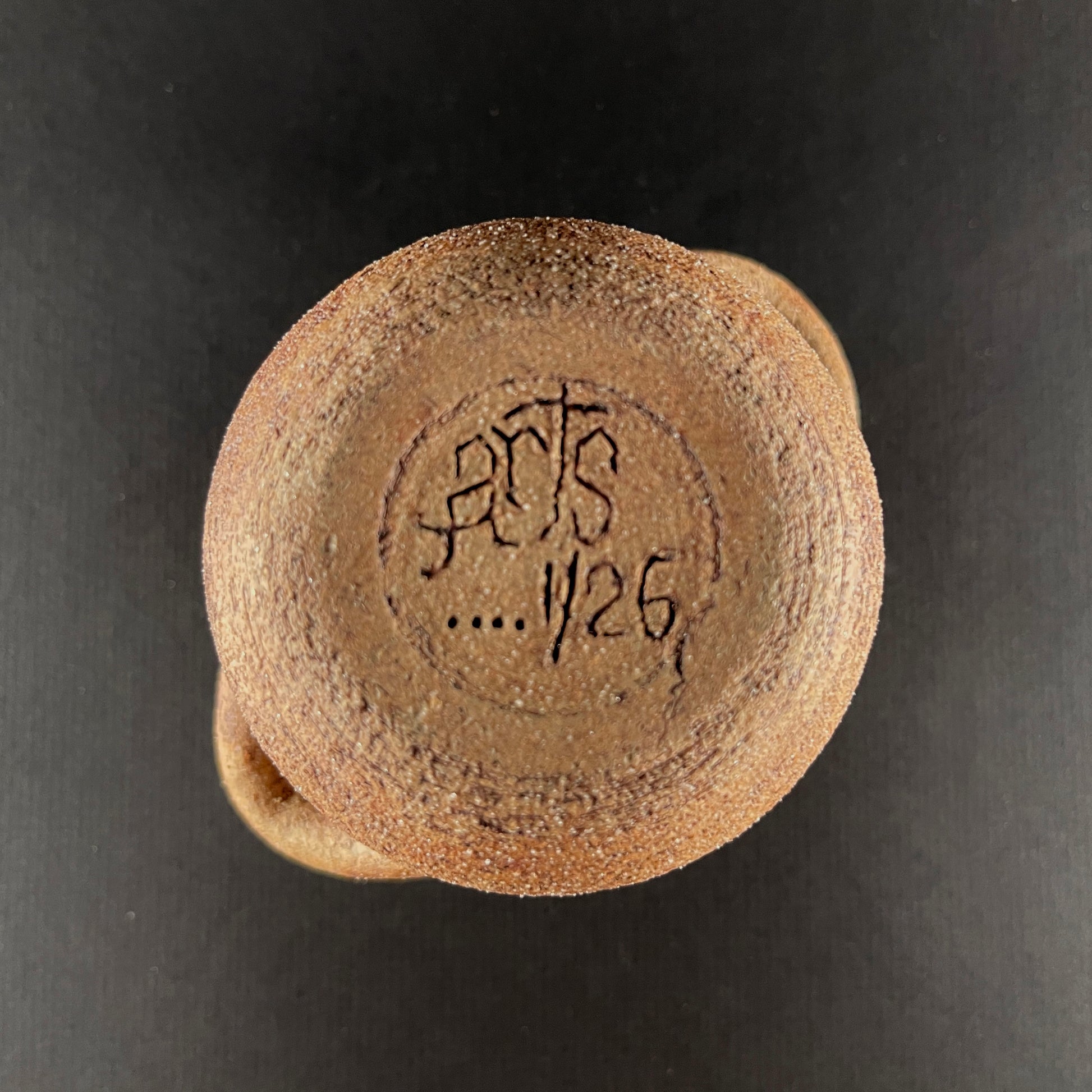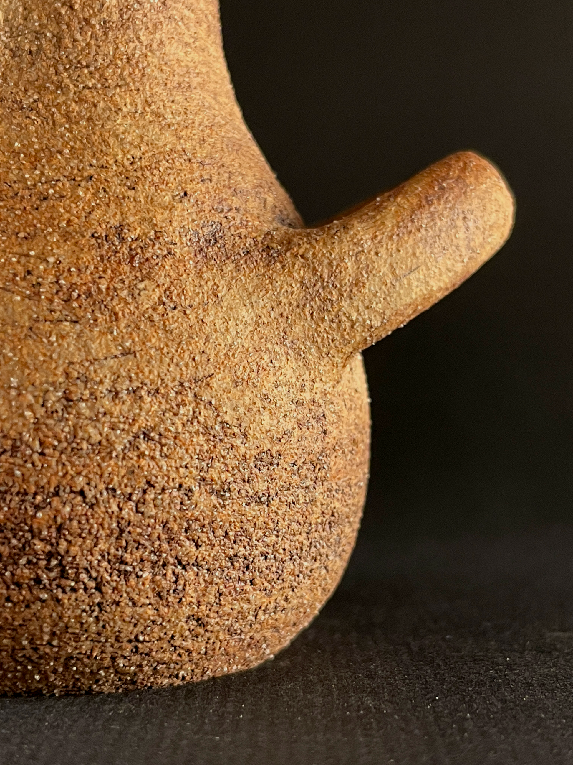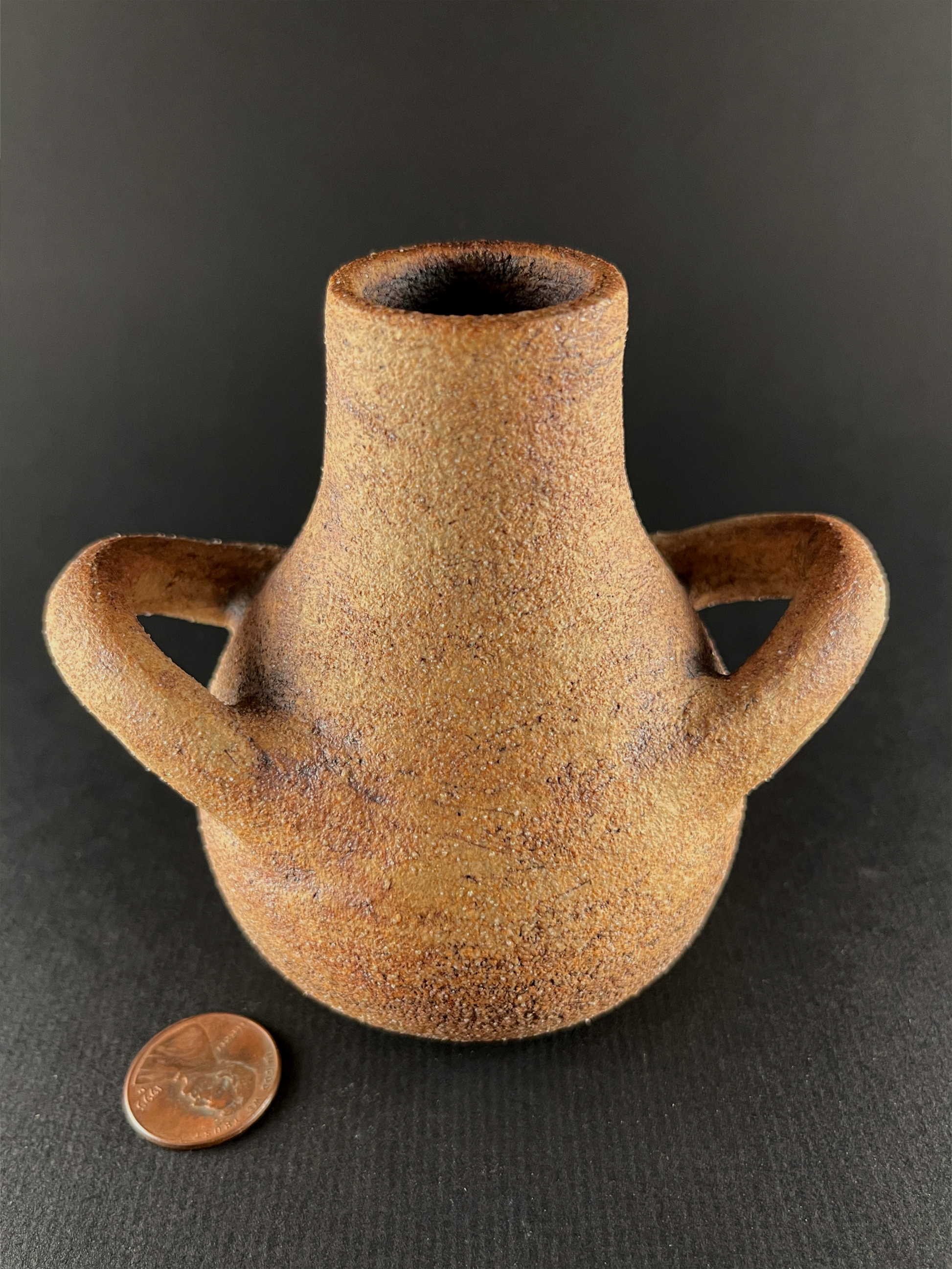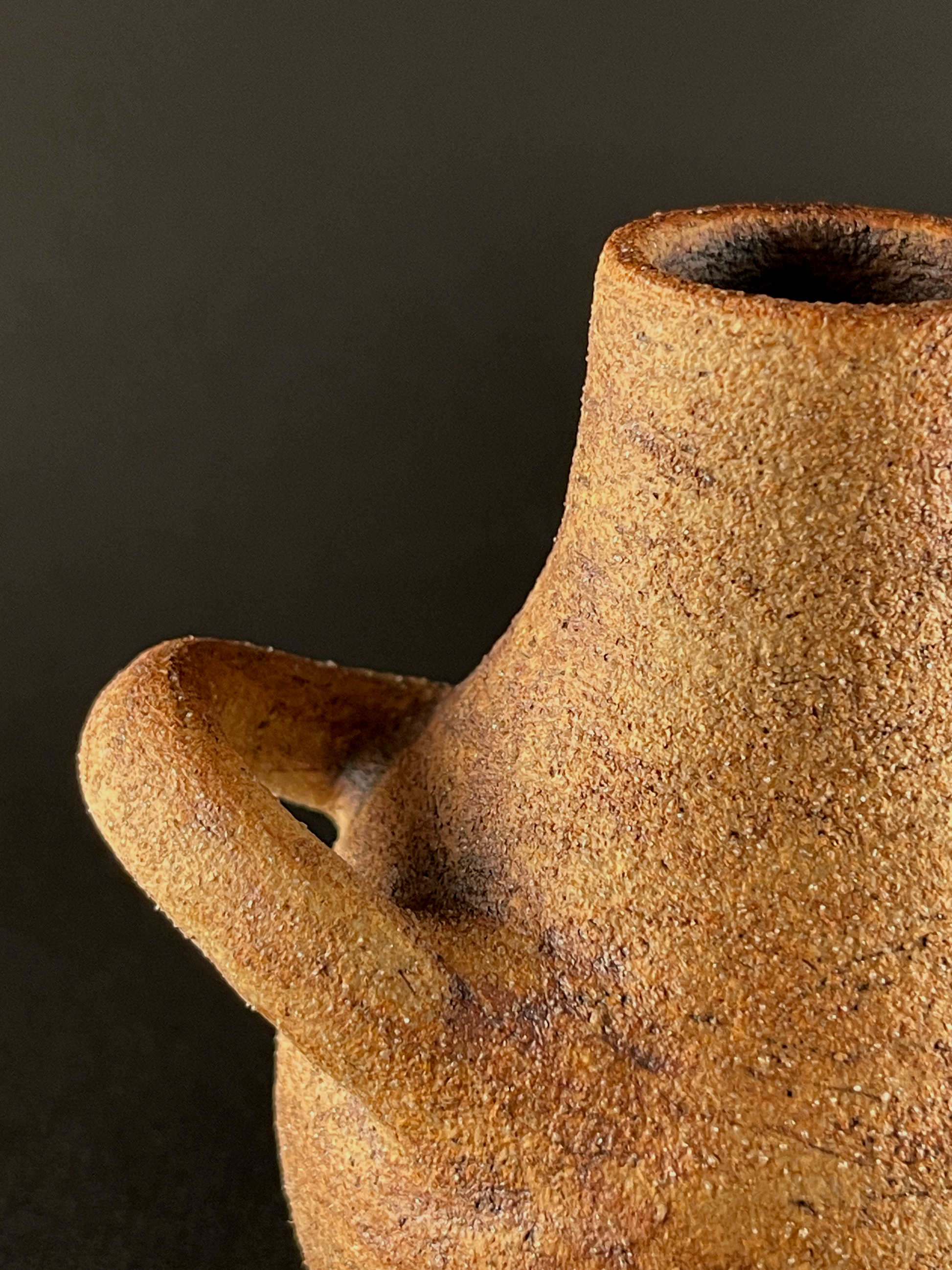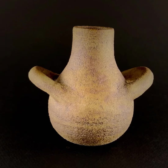 Small hand thrown bottle stained with red iron oxide. Handles added on opposite sides.